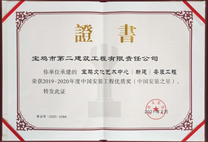 4月22日,中國安裝協(xié)會第七屆二次理事(擴(kuò)大)會議暨工程創(chuàng)優(yōu)經(jīng)驗(yàn)交流會在濟(jì)南召開。會議對2019-2020年度中國安裝工程優(yōu)質(zhì)獎(jiǎng)(中國安裝之星)獲獎(jiǎng)企業(yè)及個(gè)人進(jìn)行了表彰,由寶雞二建承建的寶雞文化藝術(shù)中心項(xiàng)目安裝工程獲此殊榮。